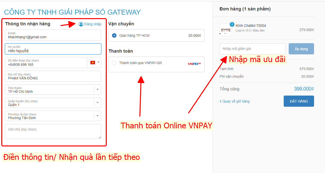Bước 3: Vào phần Thanh Toán thì quý khách điền thông tin, để biết được là tổng số tiền mình cần chi trả và nhìn sang bên tay trái, có ô [Nhập mã giảm giá] thì các bạn copy hoặc đánh mã voucher được người thân, bạn bè chia sẻ vào để nhận được quà ưu đãi nhé!